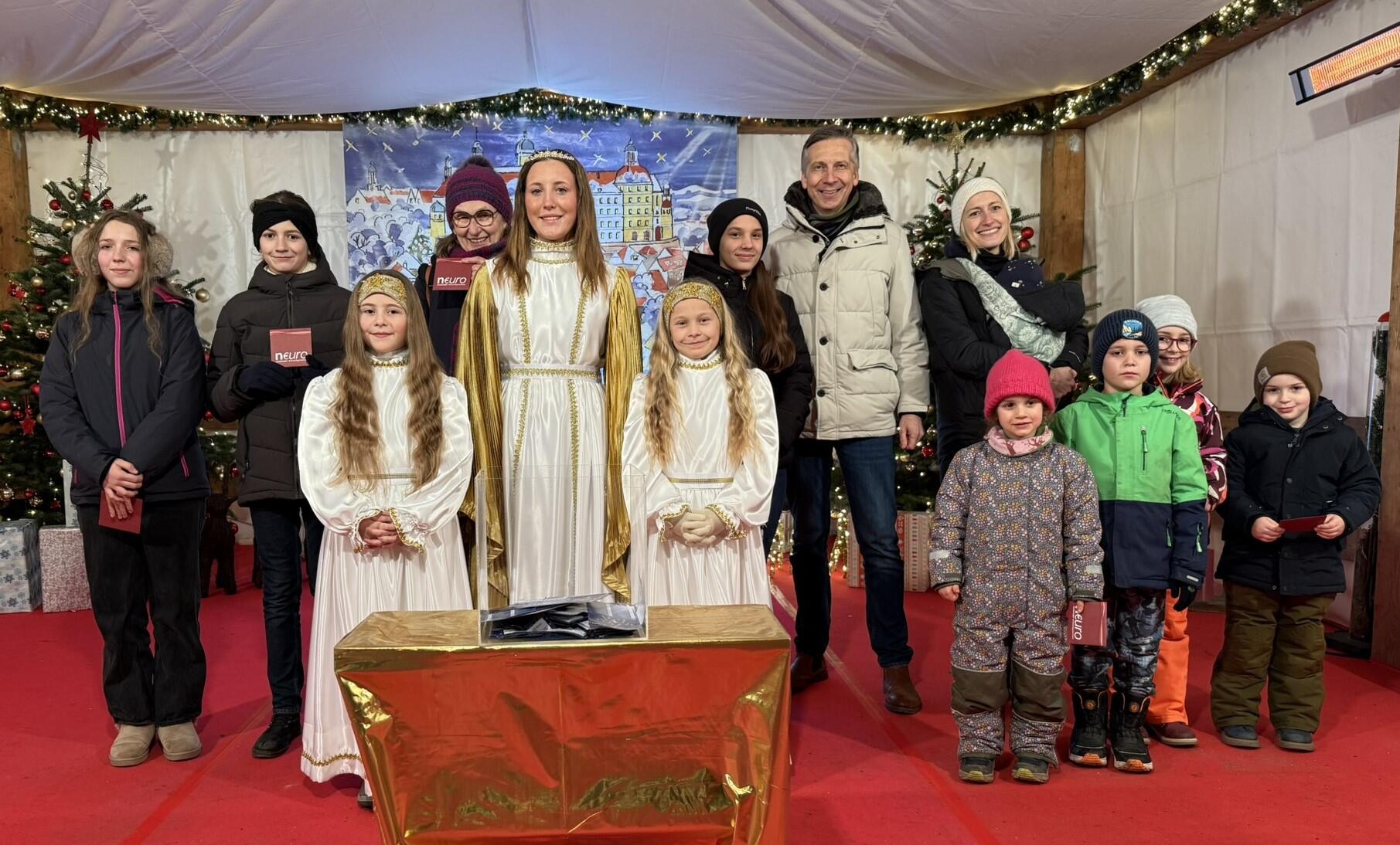 Am Dienstagabend, 16. Dezember, fand auf der Aktionsbühne am Schrannenplatz die finale Sternderlpass-Ziehung 2025 statt. Neuburgs Christkind Larissa und die Engerl Emma und Laura zogen gemeinsam mit Carolin Braun vom Stadtmarketing die glücklichen Gewinner.