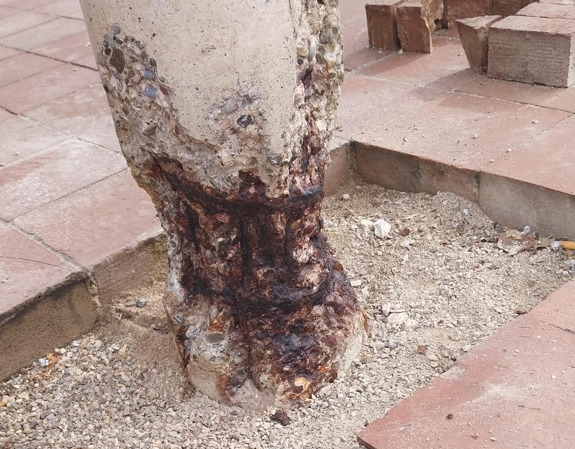 Seit 1991 gehört der markante Arkadengang rund um den Bücherturm am Sèter Platz zum innerstädtischen Stadtbild. In den vergangenen Jahren zeigte sich im Fußbereich der Betonsäulen jedoch eine Schadenshäufung, die das Tiefbauamt nicht so recht zuordnen konnte. Zu Beginn der Sanierungsarbeiten im vergangenen Jahr gingen die Fachleute noch von Entwässerungsproblemen aus. In der jetzt abgeschlossenen zweiten Sanierungsphase wurde jedoch klar, dass die Entwässerung in Ordnung ist, jedoch eine andere Flüssigkeit Probleme macht. So kann mit großer Sicherheit gesagt werden, dass Hunde-Urin die Schäden in Bodenhöhe ausgelöst hat.