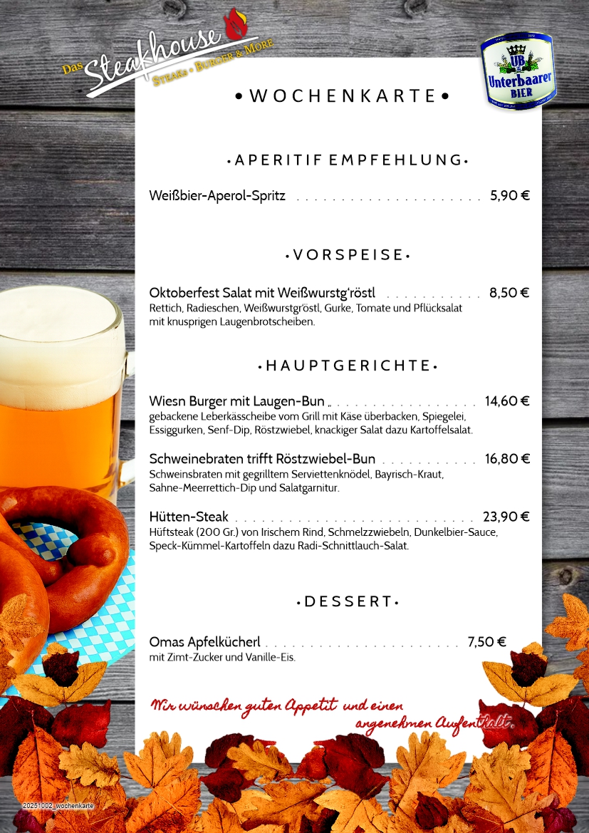 Bei den Hauptgerichten stehen Wiesn-Burger im Laugen-Bun, Schweinebraten im Röstzwiebel-Bun und das Hütten-Steak (saftig gegrillt) zur Wahl.