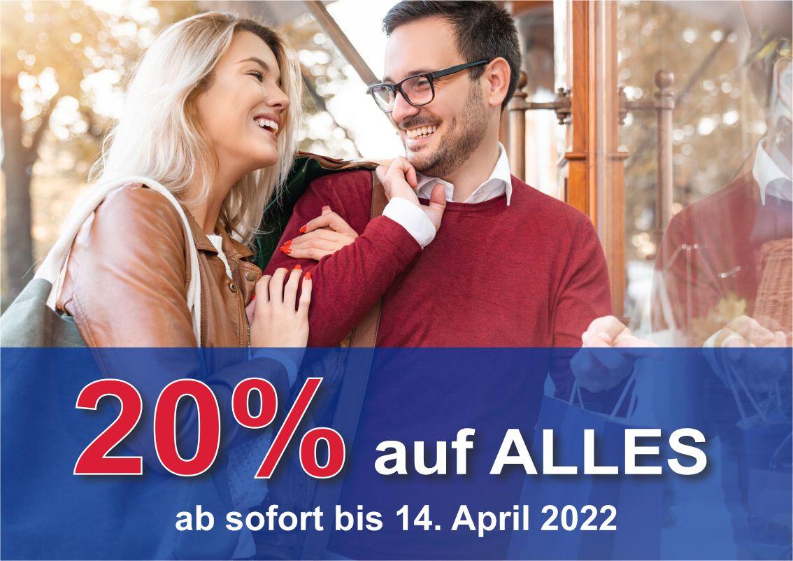 Nutzen Sie die Chance auf 20 % Nachlass für den Einkauf Ihrer neuen Frühjahrsgarderobe. Es lässt sich bestimmt in jeder Abteilung ein Schnäppchen finden, denn Sie erhalten auch auf bereits reduzierte Ware den Rabatt von 20 %.